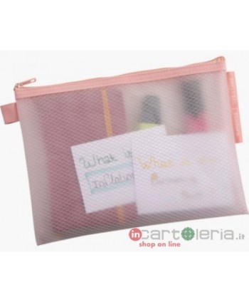 In the pastel version, the pouch can contain all types of supplies, papers, accessories, pens, beauty products, which will be carefully protected and visible thanks to the transparency.